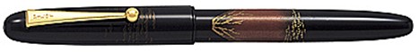 黑色漆磨光加工素材上,撒上金粉,绘制图案,之后涂上漆。干燥后,用木炭能研制出图案的手法。笔头为14k10号,笔种有F.M.附带有CON-70的墨水吸入器。