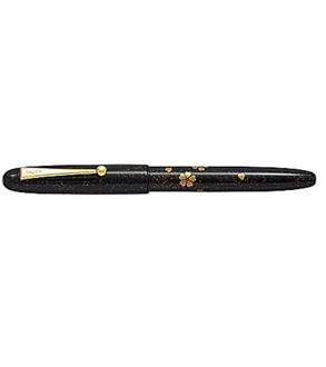 黑色漆磨光加工素材上,撒上金粉,绘制图案,之后涂上漆。干燥后,用木炭能研制出图案的手法。笔头为14k10号,笔种有F.M.附带有CON-70的墨水吸入器。