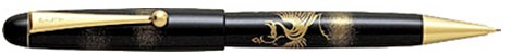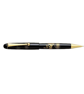 用色漆,生漆在描写的图案上撒上金粉,干燥后,涂几次漆,在凝固的地方打磨,制造光泽色的一种自来水笔。